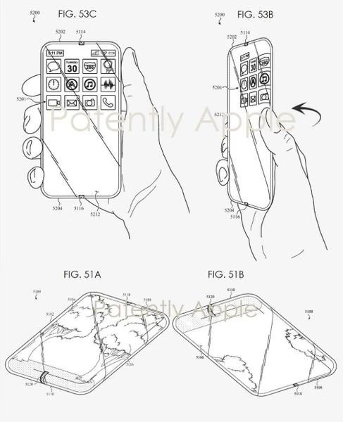 Динамики в таком случае будут находиться в маленьких вырезах в нижней и верхней части iPhone. Интерфейс, согласно патенту, может огибать всю поверхность.