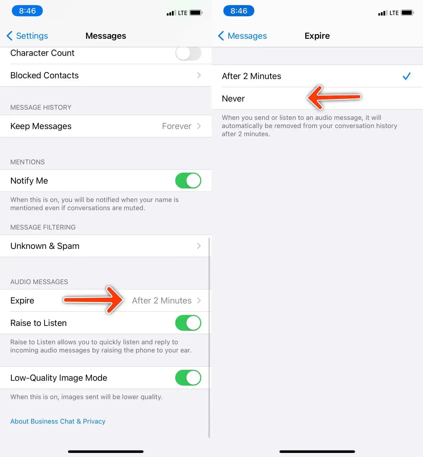 Перейдите к Звуковому сообщению> Срок действия и выберите Никогда в меню Срок действия.